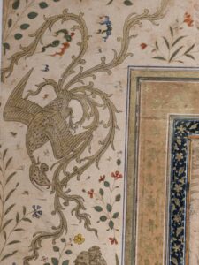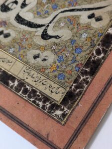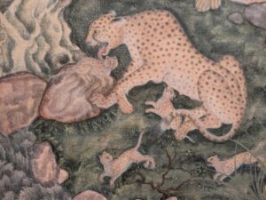 Although there was no Chinese decorated paper on view, the eyecatcher of the Islamic art auction was a group of extraordinary South Asian paintings from the personal collection of Prince and Princess Sadruddin Aga Khan on sale at Christie’s London. One highlight was a late 16th-century painting depicting a family of cheetahs in a rocky landscape from the early Mughal period. It is attributed to Basawan, a famous painter during Akbar’s reign. The painting was created on a piece of cloth, which is not a typical medium for Mughal paintings, and was further mounted with gold-flecked papers. On the contrary, silk has been extensively used for painting and calligraphy in China and Japan throughout history.