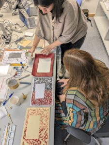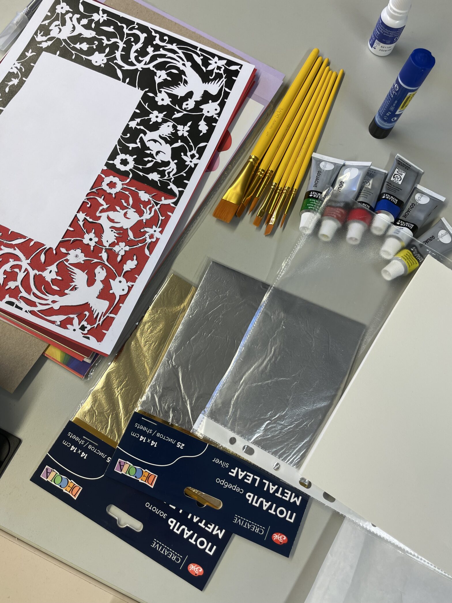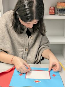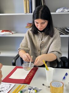 Armed with coloured thick and thin papers, gouache paints, brushes, sponges, and even gold and silver leaf, we set out to recreate some of the effects we so often analyse in images and catalogues. Negar went a step further and prepared custom stencils, cutting them from models of Persian manuscript pages, which gave us an invaluable opportunity to work with historically grounded designs.