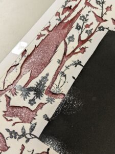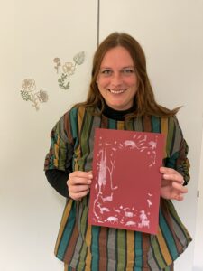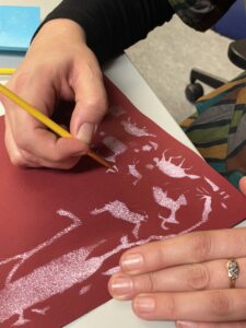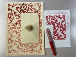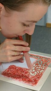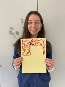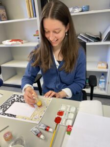 Ilse chose one of her favourite stencil motifs — a landscape with a shepherd — and rendered it in a bold, high-contrast palette: white on dark red paper. She even attempted to outline certain shapes with gold paint using a fine brush, though this quickly demonstrated another key insight of the workshop: even our “fine” modern brushes are often too coarse to replicate the extraordinary precision seen in historical manuscripts.