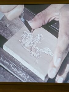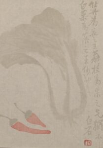 Right next to the woodblock stamps on display was the original painting created by Qi Baishi (齊白石), a renowned Republic era artist (Image 5). This painting served as the inspiration for the printed design on the final product