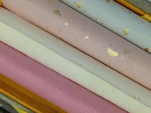 In Early March, Yih-chuen was in Beijing for research. One of the numerous highlights of her visit was a temporary exhibition on the Chinese decorated paper at the Beijing Fine Art Academy Gallery. The exhibition featured a variety of modern and contemporary objects, including gold ink-painted examples made for the famed 18th-century Qing dynasty Qianlong emperor, who attempted to revive the lost medieval decorated papers of previous dynasties recorded in primary sources.